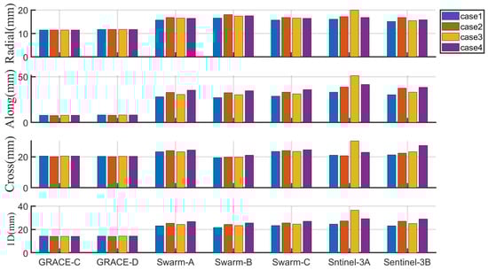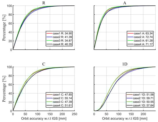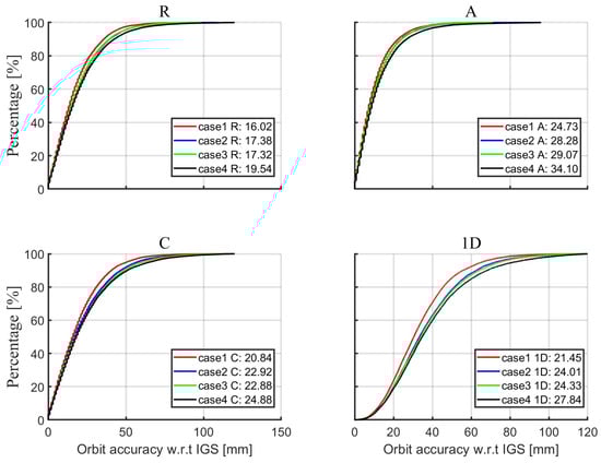 The accumulated distribution of the orbital errors of the GPS satellite for different LEO attitude quaternion situations. The average orbit accuracy for the radial, along-track, cross-track, and 1D directions for each test is given in the legend in millimeters.