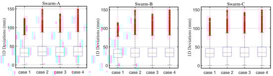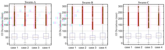 The 1D deviations in the orbital errors of Swarm satellites in integrated POD based on regional network for different LEO attitude quaternion situations.