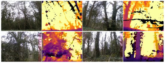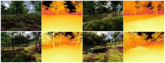 LOBDM-Forest. This dataset, introduced in a study focused on learning depth maps for occluded tree branches in forest environments, contains both real-world and synthetic data. The real-world data were captured using an Intel RealSense D435 depth sensor. Approximately 20,000 RGB and depth images of trees in temperate forests and the Masoala rainforest in Switzerland were captured. The synthetic data were generated by simulating RGB-D sensors in Unreal Engine software 4 [44] with the UnrealCV 1.1.0 [45] plug-in. To create a diverse set of virtual data, SpeedTree 10.0 [58] was used to randomly generate models of various tree species, and a simulated drone trajectory was employed within Unreal Engine to capture image data as it navigated around the trees. To improve the realism of the synthetic data, several post-processing steps were applied, including the addition of simulated sensor noise, depth value truncation at ten meters, Gaussian blurring, and rounding of depth values to mimic the image quality of a real-world depth camera. Approximately 44,000 synthetic images, each with a resolution of 640 × 480 pixels, are included in the dataset. These images simulate a diverse array of tree species and environmental conditions. Figure 3a,b shows the examples of the real-world and virtual data, respectively, illustrating the dataset’s ability to represent both natural and simulated forest scenes.