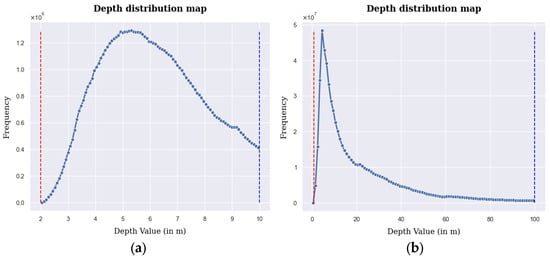 Distribution of depth values. (a) LOBDM-Forest (Synthetic); (b) Mid-Air.