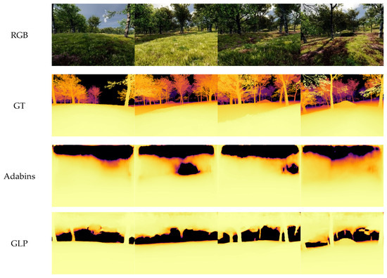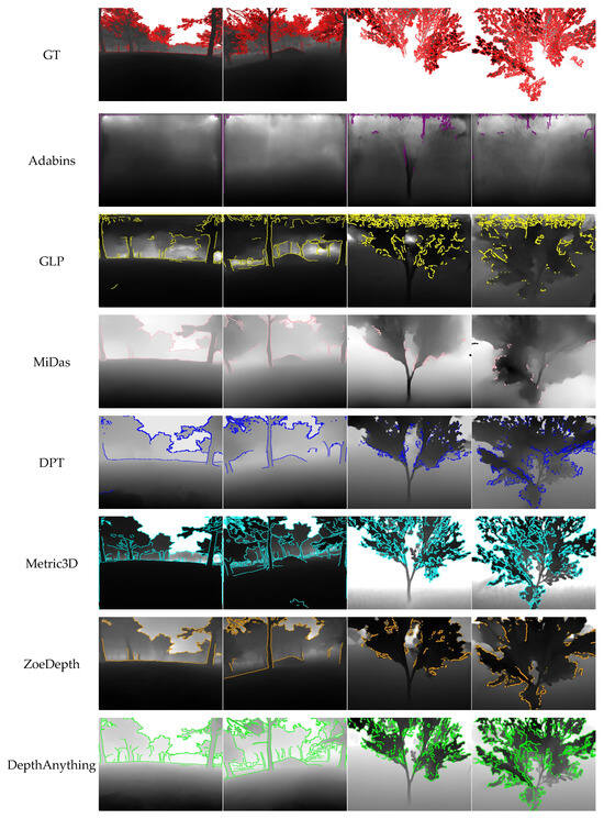 Figure 7 shows the depth estimation results on the LOBDM-Forest (Synthetic) dataset. The results were the same as for the Mid-Air dataset; both DepthAnything and Metric3D outperform other models, accurately capturing the structures of tree branches and leaves and distinguishing depth levels between overlapping foliage. This performance can be attributed to their training on large-scale datasets, which enhances their generalization capabilities. While other models, such as ZoeDepth and DPT, effectively predicted overall tree contours and detailed structures, the color mapping of ZoeDepth differed significantly from ground-truth depth maps. GLP and MiDas performed moderately well in predicting the primary tree trunk but struggled with depth relationships between branches and leaves. The performance was the same as on the Mid-Air dataset. Adabins performed the poorest, capturing only limited trunk details.