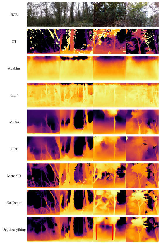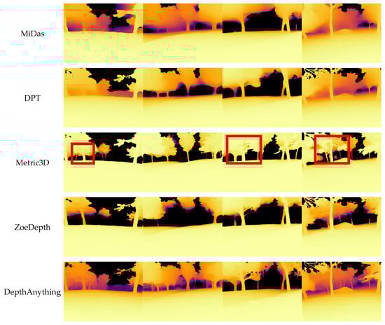 Figure 6 illustrates the performance of various models on the Mid-Air dataset. Specifically, Transformer-based models, such as ZoeDepth, DepthAnything, and Metric3D, show superior performance. Among all models, Metric3D produced the most detailed depth maps, particularly in capturing edge information in regions with depth discontinuities. For example, as shown in the red boxes in Figure 6, clear edge information can be observed between tree trunks and branches or between leaves and surrounding objects. However, its foreground predictions appeared brighter than the ground-truth depth maps, suggesting a tendency to underestimate depth values. In contrast, predictions of DepthAnything demonstrated the closest alignment with ground-truth depth maps in terms of color mapping while maintaining rich detail. MiDas and DPT produced comparable results, but with fewer details and only showing the main branches of trees. GLP can effectively capture unobstructed tree trunks but struggled with the contours and details of leaves. Adabins, trained primarily on indoor datasets, failed to generate meaningful predictions for outdoor forest scenes due to insufficient generalization capability. In contrast, models trained on diverse outdoor datasets, such as ZoeDepth and DPT, have shown robust performance and generalization.