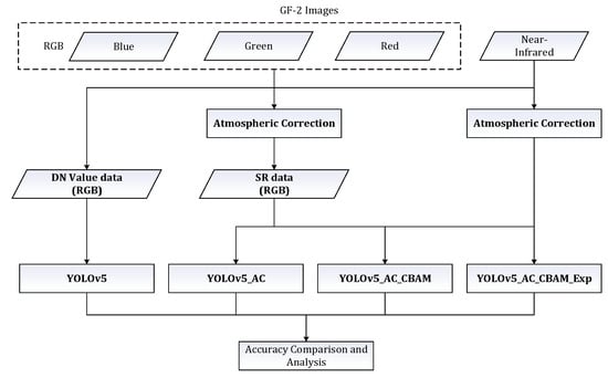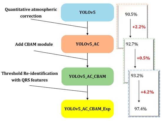 - Quantitative AC processing was incorporated into the preprocessing stage of HSR images to restore the true spectral characteristics of ground objects. Two distinct types of HSR wind turbine sample databases were established. One was the DN (Digital Number) value sample database, which lacks RS features due to the absence of quantitative AC in the image preprocessing stage. The other was the SR sample database, which preserves spectral reflectance and other RS features as a result of the inclusion of quantitative AC during preprocessing. Compared with DN value data, the performance of SR data was significantly enhanced for TDI on the YOLOv5 model.