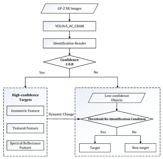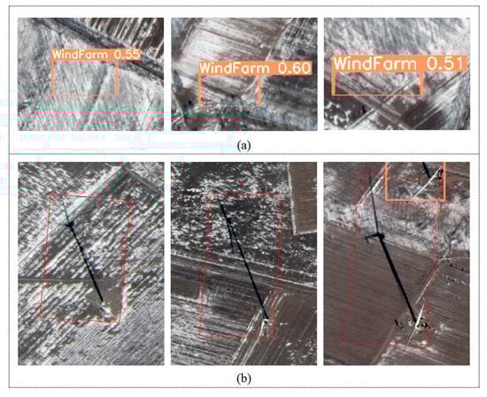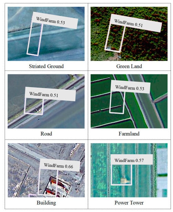 - Based on the identification results of the model, the unique quantitative spectral reflectance, geometry, and texture features of the wind turbine target were selected using RS expert knowledge as the dynamic threshold discrimination conditions, and the re-identification of the wind turbine was further carried out. The integration of quantitative information effectively eliminated many false detection objects, and the performance was excellent.