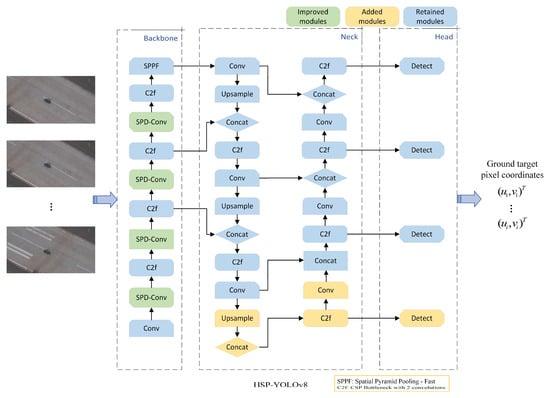 16]. We added an extra tiny prediction head and a null-depth convolution module to the YOLOv8 algorithm and a post-processing algorithm more suitable for small target recognition, the Space-to-Depth Convolution (SPD-Conv) module. In the fixed-wing UAV high-altitude reconnaissance scenario, the network structure that has been specially designed by us runs on a single-board Raspberry Pi 5, and the algorithm has a speed of 5 FPS, which is consistent with the laser measurement distance frequency. The input and output of the algorithm and the network structure are shown in
