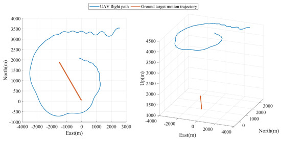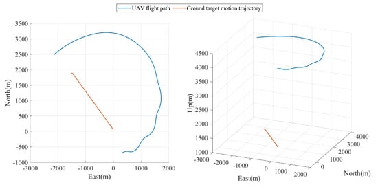 In experiment C, the ground-motion target made a folding back for one lap motion along a section of a closed road, with a speed of about 35 km/h for the first half of the motion from rest and about 65 km/h for the second half of the motion. At the same time, the UAV flew asymptotically at a distance of 5300 m from the ground target to 3600 m from the ground target to transform into an encircling flight to reconnoiter the ground target and collect the required data. The UAV flight trajectory and ground target movement trajectory are shown in