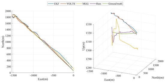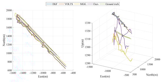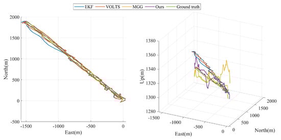 Figure 11, it can be seen that among the two-dimensional trajectories in the horizontal plane output by the four algorithms, HPLTMSE best fits the real motion trajectory of the ground target, MVBMTG is a little bit worse, and VOLTS and EKF perform the worst in terms of accuracy. It is worth noting that the MGG algorithm has a larger tracking trajectory error at this point when the ground target turns its direction due to the large changes in the UAV’s visual image and the increased difficulty in image alignment. As can be seen in