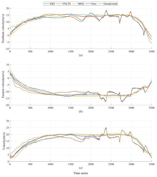 Figure 12. From the figure, it can be seen that the purple curve is closest to the green curve when the ground target’s motion speed changes, i.e., the HPLTMSE algorithm has the fastest response to the ground target’s motion state estimation among the four algorithms. The VOLTS and EKF algorithms are subject to large fluctuation distortions in ground target motion state estimation due to the poor performance of the results of the geolocalization and tracking of ground targets.