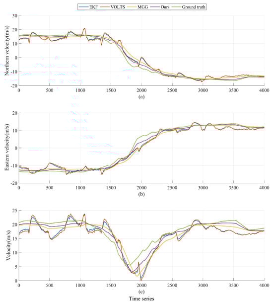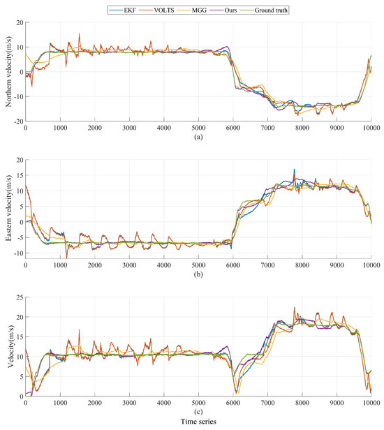 Figure 14. The EKF, VOLTS, and MGG algorithms are used for geolocalization tracking and the motion state estimation of ground-motion targets for the third set of UAV time series data collected, respectively, to compare and verify the performance of the HPLTMSE algorithm proposed in this paper.