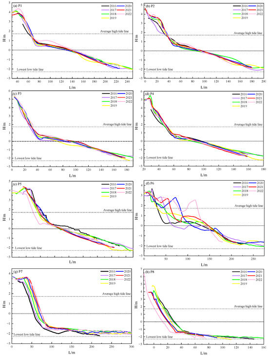 GNSS RTK was applied to acquire signals from the CORS (Continuously Operating Reference Stations) network in Shandong Province. The survey was conducted during the low tide of the spring tide and involved data collection from 11 profiles over seven years, from 2016 to 2022. Prior to observing each profile, a comparison was made at the profile’s starting point, which served as an E-level GPS control point. The differences observed during this comparison were maintained within 2 cm in planar distance and 5 cm in elevation. Sampling measurements were taken from the starting point toward the sea along the deployed monitoring profile, with an average sampling interval not exceeding 1.5 m. In regions characterized by significant terrain undulation, such as the beach berm, sampling points were densified. Each measurement point was required to deviate no more than ±0.1 m from the designated survey line.