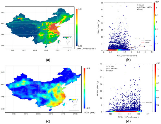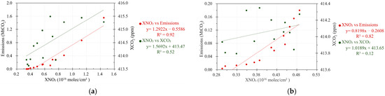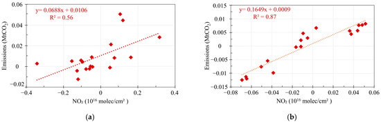 Additionally, we also compared the relationship between atmospheric NO2 and CO2 concentrations. Figure 13 shows a correlation between NO2 differences and CO2 differences, which are the values in April–May in 2022 minus the values in the same period in 2021. It is evident that the correlation between NO2 and CO2 shows consistency in Figure 12c,d.