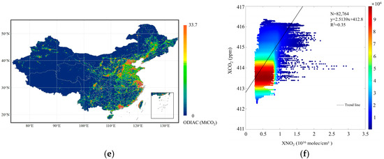 Response of NO2 and XCO2 to anthropogenic CO2 emissions in China (a) annual average of NO2 (b) correlation between NO2 and ODIAC in grids (c) annual average of XCO2 (d) correlation between XCO2 and ODIAC in grids (e) annual average of ODIAC, and (f) correlation between NO2 and XCO2 in grids.