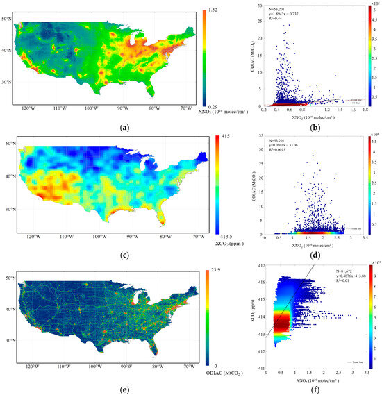 Response of NO2 and XCO2 to anthropogenic CO2 emissions in the United States (a) annual average of NO2 (b) correlation between NO2 and ODIAC in grids (c) annual average of XCO2 (d) correlation between XCO2 and ODIAC in grids (e) annual average of ODIAC, and (f) correlation between NO2 and XCO2 in grids.