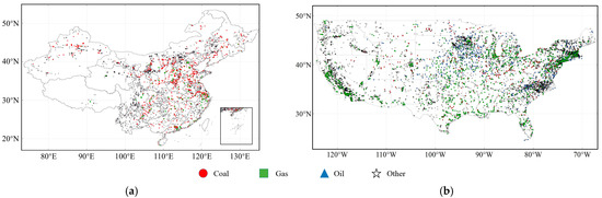 Types of power plants in the study areas: (a) China and (b) the United States.
