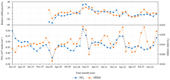 Time variation in monthly averaged NO2 and ODIAC emissions (lower), and the relative variation (upper) calculated as the year-on-year difference in the same month divided by the value of the same month in the previous year, in the United States from 2019 to 2022.