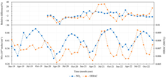 Time variation in monthly averaged NO2 and ODIAC emissions (lower), and the relative variation (upper) calculated as the year-on-year difference in the same month divided by the value of the same month in the previous year, in China from 2019 to 2022.