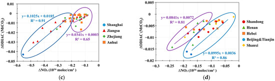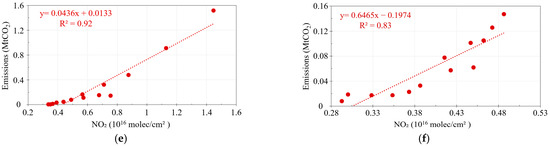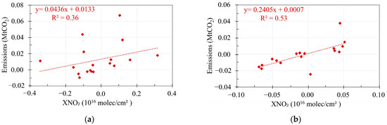 Figure 12 shows the response relationship between the NO2 differences and the anthropogenic CO2 emission differences in January–February 2020 and April–May 2022 to the previous year in the same period calculated based on the administrative boundaries. Figure 12a,b is similar to the regional response results investigated by Sheng et al. in the January–February 2020 scenario, which also showed the regional characteristics of the response relationship between NO2 concentration and anthropogenic CO2 emission changes, closely related to pollution-emitting industries, as well as emission sources such as transportation.