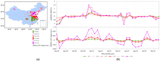 Additionally, Figure 9 presents the changes in the year-on-year differences in NO2 and ODIAC in the same month from 2020 to 2022 for C9–C14 in China, aiming to detect the magnitude of NO2 changes in high-pollution emission areas. It can be found that variations in NO2 and anthropogenic CO2 emissions showed more significant differences than the overall differences shown in Figure 6, with a significant reduction during January–February 2020, particularly in the C14 that covers the regions of Beijing–Tianjin–Hebei and Shanghai. We can quantify the changes in NO2 concentrations and anthropogenic CO2 emissions using these special scenarios of the extreme reduction in human activities.