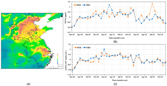 The YRD and BTH study areas and the year-on-year differences in XCO2 (b) and NO2 (c) in the same month from 2020 to 2022 in both areas. The base map in (a) is the four-year mean concentration of NO2 from 2019 to 2022, with black dots indicating the locations of prefecture-level cities in China.