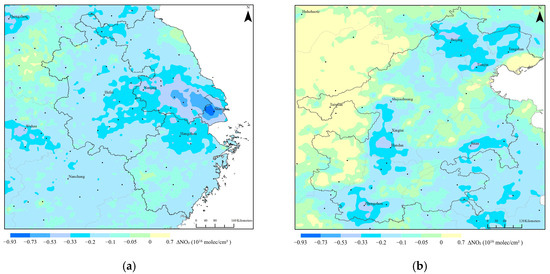 Figure 11 shows the spatial distribution of the difference in NO2 concentration between April and May 2022 and the same period in 2021 for the YRD and BTH regions. As seen in Figure 11a, the largest decrease in NO2 concentration is centered around Shanghai in the YRD, with a gradual reduction in NO2 concentration radiating outward from the city. During this period, the significant reduction in human activities, including transportation, urban economic activities, and power generation in large power plants in the YRD, especially in Shanghai, resulted in a maximum decrease in NO2 concentration by −0.73 to −0.93 × 1016 molec/cm2. In the BTH region, the reduction in NO2 concentration is smaller, and the area of reduction is also more limited. Notable decreases in NO2 are observed only in major cities such as Beijing, Tianjin, and Tangshan, and cities such as Handan and Xingtai. In the BTH region, the reduction in human activities was less pronounced; the maximum decrease in NO2 concentration was −0.53 to −0.73 × 1016 molec/cm2.