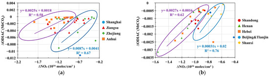 Correlation of NO2 differences to CO2 differences, which is the values in April–May in the year 2022 minus the values in April–May in the year 2021 for (a) YRD (b) BTH.