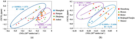 Correlation of NO2 to anthropogenic CO2 emissions and XCO2 in clustered areas (a) China and (b) the United States.