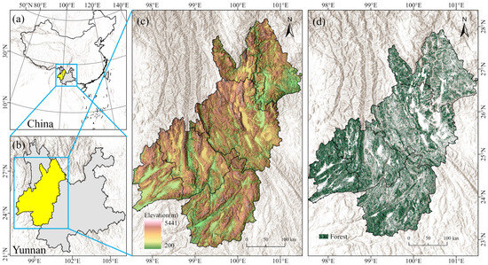 Maps showing the location of the study area. The study area locations in (a) China and (b) Yunnan Province. (c) The digital elevation model (DEM) of the study area was obtained from ALOS AW3D30. (d) A forest map of the study area extracted from Dynamic World V1 LULC-2018.