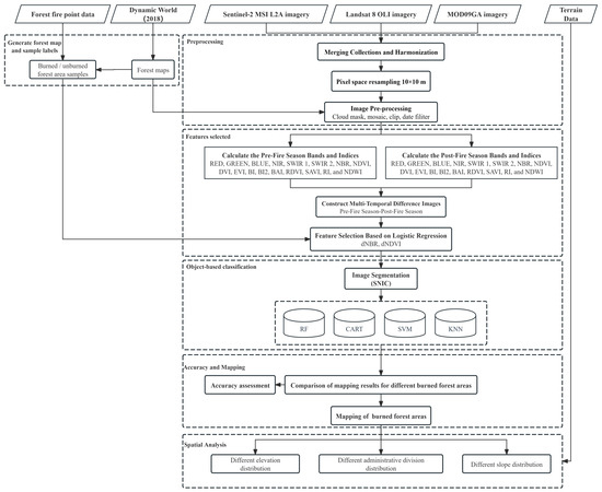The features generated from L8+S2+MODIS imagery used in this study were processed by the SNIC image segmentation algorithm. These processed features were then used as parameters of RF, SVM, KNN, and CART, the classification accuracies of which were compared to choose the best classification model to map burned forest areas. The results indicate that in western Yunnan, a region characterized by complex vegetation types and a widespread tree distribution, optical data demonstrated higher accuracy in classifying burned areas, while the synergistic use of optical and SAR imagery did not significantly enhance the classification results. Among the compared algorithms, the RF algorithm performed optimally, achieving an overall accuracy of 96.32% and a Kappa coefficient of 0.951, while the KNN and CART algorithms showed a relatively poor performance. Additionally, spatial analysis of the burned areas reveals the distribution characteristics of forest fires across different terrains and slope conditions, indicating that regions with medium elevations (800–1600 m) and slopes of 15–25° are at a higher risk of fire, with the largest areas of forest being burned. This study offers a precise and effective solution for large-scale forest fire mapping and potential widespread wildfire mapping, with the potential to be applied in national and global forest fire monitoring and assessment.