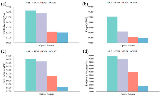 The performance of the validation model is assessed based on the results from confusion matrices derived from RF, SVM, KNN, and CART classifiers. (a) OA; (b) Kappa; (c) UA; (d) PA.