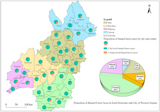 Proportion and distribution of burned forest areas at the municipal and county levels in western Yunnan.