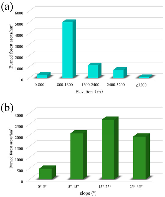 Burned forest areas at different elevations and slopes in western Yunnan. (a) Elevation and (b) slope.