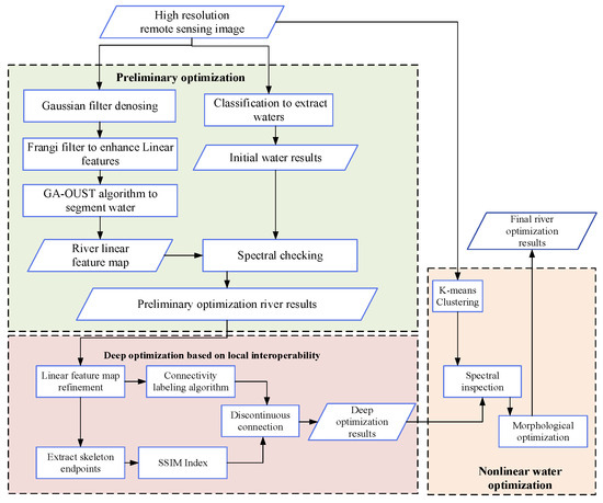 In this paper, a river connection optimization method as part of high-resolution remote sensing images is proposed. This method focuses on the preliminary optimization of linear water bodies and the disconnection problem in water body extraction to conduct in depth optimization, in order to improve the accuracy and integrity of water body extraction results. To effectively solve the problem of false detection and missed detection of fine and small rivers in the initial results, this paper proposes a new linear feature preliminary optimization method. Firstly, the global features of high resolution remote sensing images are extracted by the Frangi filter, to significantly enhance the linear feature response in the image in order to accurately identify the linear river; this effectively supplements the initial results of the river obtained by the classification method, to obtain the preliminary optimized river information. To address the problems of discontinuous rivers in the preliminary optimization results, this paper proposes a depth discontinuous river connection optimization method, which combines the local connected domain labeling algorithm and SSIM index to connect the discontinuous river parts. Finally, to further inspect the nonlinear water information, K-means clustering and spectral–morphological joint inspection are used to supplement the large water area with holes, remove noise interference, and optimize the details of the water. Experiments show that the proposed method can effectively connect disconnected rivers, improve the problem of discontinuous optimization, and further improve the accuracy of optimization.