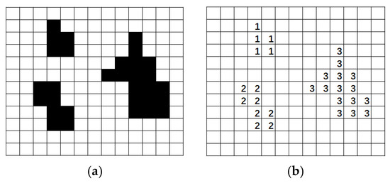 Schematic diagram of the connected domain tagging algorithm. (a) Water extraction results. (b) Labeling results. 1–3 represent different water pixels group with different labels.