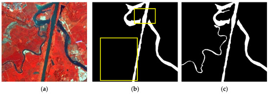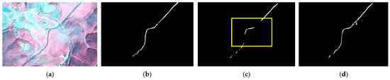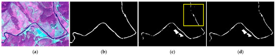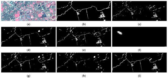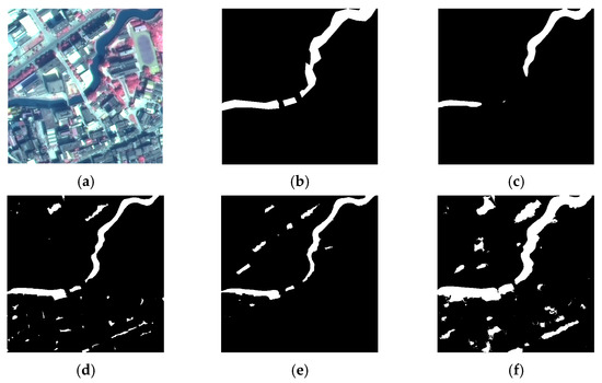 To prove the effectiveness and robustness of the proposed method, a high-resolution remote sensing image was selected for experimental analysis, and the image was recorded as S1, as shown in Figure 4a, Figure 5a, Figure 6a and Figure 7a. The ground truth labels are shown in Figure 4b, Figure 5b, Figure 6b and Figure 7b. There are various types of objects, such as buildings, lakes, woodlands, farmlands, and roads. In this paper, we designed an U-Net-based network which is used to extract the initial water body from high resolution images. After preliminary processing, the extraction result is used as the initial result, as shown in Figure 4c, Figure 5c, Figure 6c and Figure 7c. The comparative results are shown in Figure 4d–h, Figure 5d–h, Figure 6d–h and Figure 7d–h. The accuracy comparison results of the three methods are shown in Table 1, Table 2, Table 3 and Table 4. Our proposed method is shown in Figure 4f, Figure 5f, Figure 6f and Figure 7f.