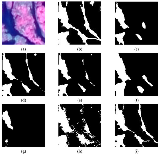 Comparison of water optimization results of image S1. (a) Image S1, (b) Ground truth, (c) Initial results, (d) Small water optimization, (e) SVM classification, (f) MFGF_U-Net, (g) MSResNet, (h) MECNet (i) Ours. White pixel represents water. Black pixels represents non-water.