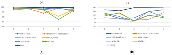 In order to test the effectiveness of the proposed method, five methods are compared. First, small water optimization [64] and SVM classification [65] are selected as traditional comparative methods, while MSResNet [66], MFGF_U-Net [67] and MECNet [68] are compared as deep learning-based methods. Small water extraction [64] proposes using multi-scale and spectral difference segmentation to extract large water bodies and proposes an object-oriented water index Brightness Green ratio BGR for small water bodies. SVM classification [65] uses the SVM algorithm, which is known for its high classification accuracy, is highly robust to noise, and capable of handling complex water distributions. Its flexibility allows it to adapt to various data types, making it particularly effective in diverse water environments. MSResNet [66] enhances water detection by leveraging multi-scale residual convolution (MSDC) for capturing global context through global average pooling (GAP) and dimensionality reduction, while multi-scale feature fusion (MKMP) preserves and refines structural details through upsampling and feature stitching. The integration of these modules enables effective multi-scale feature extraction, significantly improving water body differentiation and detection accuracy. MFGF_U-Net [67] utilizes a U-shaped encoder–decoder structure with ConvBR blocks and upsampling to efficiently extract and restore feature maps. To handle water bodies of varying sizes and shapes, it integrates a gated multi-filter inception (GMF-Inception) module and an attention mechanism, leveraging multi-modal information for improved segmentation accuracy, robustness, and computational efficiency. MECNet [68] uses a multi-feature extraction and combination module, incorporates a multi-scale prediction fusion module for fine contour detection, and employs an encoder–decoder semantic feature fusion module to enhance feature consistency, achieving water extraction.