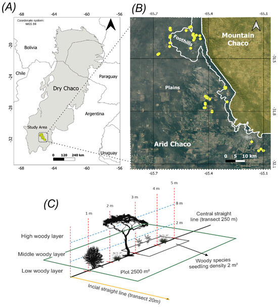 (A) Location of the study area (dotted-line box) within the dry Chaco (gray area). (B) Distribution of sampling sites (yellow circles) used for field data collection and Sentinel-2A image analysis across foothills and plains within the Arid Chaco landscape. (C) Methodological scheme illustrating field data collection through plot-based surveys and sampling transects. Maps have been prepared on QGIS Development Team (2024). QGIS Geographic Information System (Version 3.34). Open Source Geospatial Foundation Project. Maps Data: Google, ©2024 Airbus.