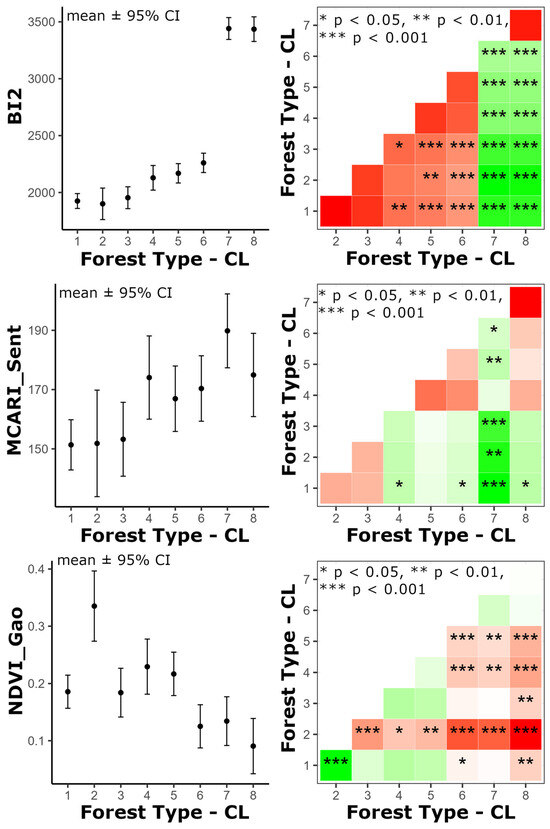 Marginal means of spectral indices for the eight forest types, estimated via a linear mixed model. The left panel shows mean values with 95% confidence intervals, while the right panel compares forest ecosystems. Green cells indicate higher average values for the column forest type; red cells indicate the opposite. Asterisks denote significance: * p < 0.05, ** p < 0.01, *** p < 0.001. Forest types and conservation levels (CL) are as follows: mature forests on foothills (CL 1), plains (CL 2); closed forests on foothills (CL 3), plains (CL 4), low closed forests (CL 5), shrublands (CL 6), savannas (CL 7), grasslands with trees (CL 8).
