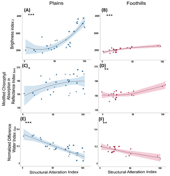 We evaluated the relationship between the spectral indices and the Structural Alteration Index (SAI) using general linear models (GLMs). SAI was included as a predictor variable, while the average values (monthly and annual) of each spectral index (BI2, MCARISent, and NDWIGao) were included as response variables in the GLMs (13 GLMs per spectral index). The landscape (plains and foothills) was included as a categorical predictor. To assess the normality of residuals, we performed the Shapiro–Wilk normality test. Additionally, we calculated the Akaike Information Criterion (AIC) for each model and compared it with the AIC of a null model [80]. The analyses were conducted in R version 4.3.2 [71] using the packages ‘ggplot2’ [72], ‘sf’ [81], and ‘terra’ [82].