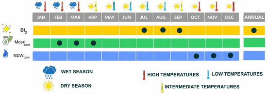 Temporal variability in the effectiveness of spectral indices (BI₂, MCARISent, NDWIGao) in differentiating conservation and management categories of forests in the Arid Chaco. Wet (<70 mm) and dry (>70 mm) months, along with temperature levels (high: >25 °C, intermediate: 15–25 °C, low: <15 °C), are reported to capture seasonal forest dynamics.