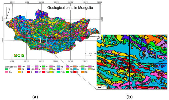 (a) Geologic units of Mongolia. Data: USGS geological survey [19]. The white box indicates the area containing the three ROIs. (b) Location of the three analyzed ROIs. The three areas of interest are situated within the Quaternary basalt fields (Q) of the blue unit, which form gently undulating surfaces.