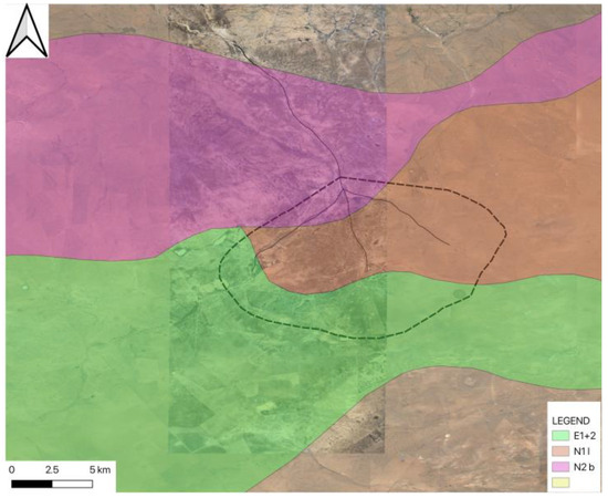 This area is characterized by basalts (unit β3 of the geological map, Miocene to Pleistocene [31]), but it also comprises granitoid units (unit γ2 of the geological map, Middle-to-Late Jurassic geological map [27]) and clastic rocks consisting of marlstones, basalts, and Ca-sulfates (units E1-2 and N1–N2 of the geological map, Paleo to Neogene [27]) (Figure 5).