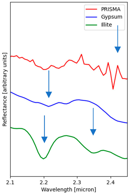 Comparison between a PRISMA spectrum, acquired at the red diamond symbol in Figure 6, and laboratory USGS [30] spectra of gypsum (HS333.3B) and illite (IL101 2M2). Arrows indicate the diagnostic absorption of gypsum and illite in NIR.