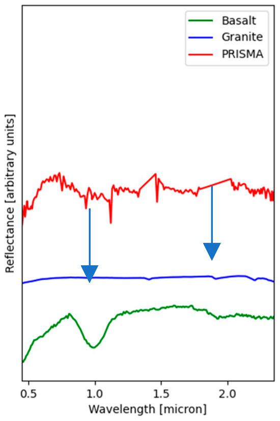 Comparison between a PRISMA spectrum, acquired at the red square symbol in Figure 6, and USGS [30] laboratory spectra of basalt (Mafic Basalt.H1) and pigeonite (HS199.3B). Arrows indicate the absorption features of reference basalt in this range. The diagnostic absorption features at 1 μm and near to 2 μm are due to pyroxene and olivine femic minerals.
