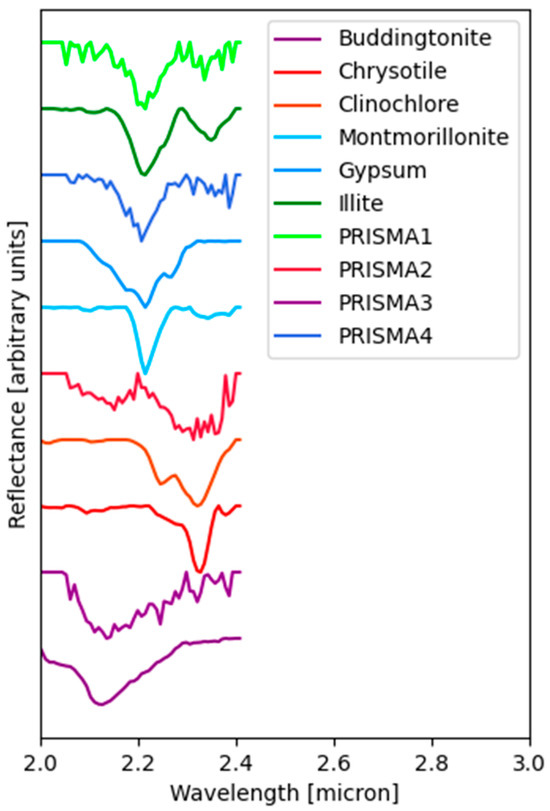 In particular, as reported by [29], illite was identified on the basis of the main absorption near 2.20 μm and a weak one around 2.35 μm. This last absorption allowed to distinguish between illite and smectite. Chlorite was identified on the basis of the co-presence of absorptions at 2.25–2.33 μm, whereas calcite was identified by a broad absorption around 2.34 μm. Since quartz and albite are featureless in the range of PRISMA, they were identified by comparison of the profile shape with albite and quartz from the USGS spectral library [30].