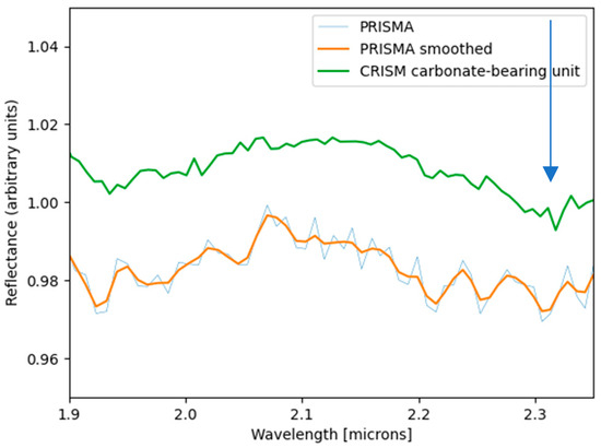 Comparison between a PRISMA spectrum (smoothed), same as the “PRISMA 2” spectrum in Figure 10, and a CRISM carbonate-bearing unit Jezero crater, as reported by [35]. The arrow highlights diagnostic absorption feature of carbonates.