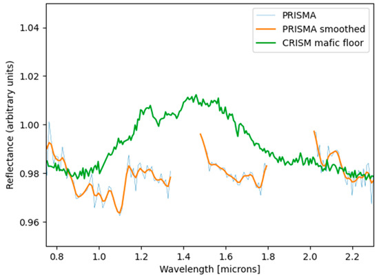 Comparison between a PRISMA spectrum (smoothed), acquired at the red square symbol in Figure 6, and a CRISM spectrum representing mafic floor at Jezero crater, as reported by [35].
