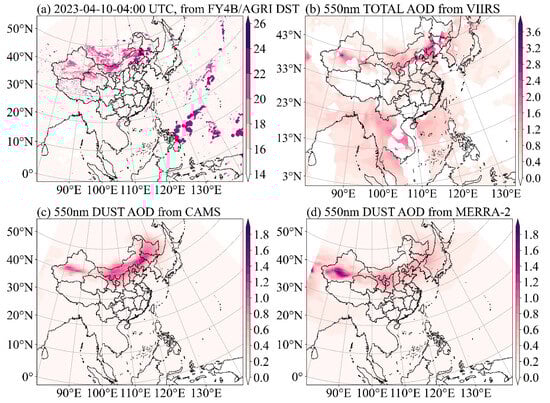 (a) The FY-4B/AGRI DST product at 04:00 UTC on 10 April 2023. (b) Visible Infrared Imaging Radiometer Suite (VIIRS)/NOAA20 550 nm total AOD. (c,d) Dust AOD at 550 nm from CAMS and MERRA-2, respectively.