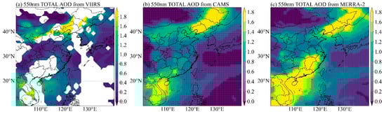Spatial distribution of AOD estimated at 550 nm over land and ocean on 10 April 2023: (a) VIIRS/NOAA20, (b) CAMS, (c) MERRA-2.