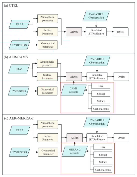 The experimental design for conducting BT simulations using ARMS with the CAMS and MERRA-2 aerosol reanalysis data is depicted in Figure 4. In this study, the fifth-generation ECMWF atmospheric reanalysis data (ERA5) were used to determine atmospheric parameters such as the temperature, humidity, ozone, and pressure, as well as surface parameters like the surface temperature and 10 m wind direction and speed, all of which were input into ARMS. The ERA5 atmospheric and surface parameters have a horizontal resolution of 0.25° × 0.25°, with an hourly temporal resolution. The atmospheric profiles cover pressure levels from 1000 hPa to 1 hPa, with a total of 137 vertical layers. Additionally, geometric parameters from the GIIRS were used, including the latitude, longitude, solar azimuth angle, solar zenith angle, sensor azimuth angle, and sensor zenith angle. The MERRA-2 and CAMS provide dust, sea salt, sulfate, and carbonate aerosols in the AER_CAMS and AER_MERRA-2 experiments, respectively. Therefore, in the ARMS input profiles, the aerosol profiles come from different data sources, while the atmospheric parameters such as the atmospheric temperature, humidity, ozone, and pressure profiles, as well as surface parameters like the surface temperature and 10 m wind direction and speed, are all derived from ERA5 reanalysis data. The geometric parameters are obtained from the FY-4B/the GIIRS level 1 data. To account for differences in data resolution among the CAMS, MERRA-2, GIIRS, and ERA5, spatiotemporal matching was performed. To convert the three-dimensional aerosol mixing ratio (kg/kg) from the MERRA-2 and CAMS reanalysis into the aerosol mass density (kg/m2) for ARMS, we conducted unit transformations following the methodology of Buchard et al. [45]. Three experiments were designed for this study: